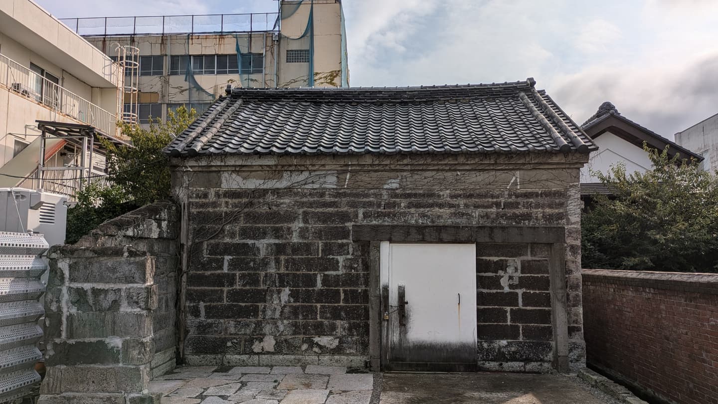奥の東端には大正期の石蔵と煉瓦塀が一望できる