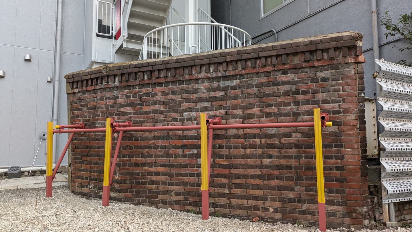 北側の約2.2mの高さの煉瓦塀は上部がコーニス装飾である